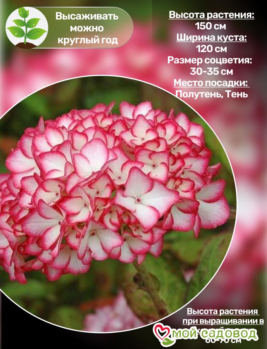 Кустарник раскидистый 1,5 м. Окраска соцветий бело-розовая, зависит от состава почвы. Соцветия округлые 30-35 см, цветки звездчатые. Цветение повторяющееся, стебли сильные, вертикальные. Листья зеленые, заостренные. Рекомендуется мульчирование на зимний период. УХОД Гортензии влаголюбивы. При отсутствии дождей раз в неделю их необходимо поливать из расчета 15-20 л на куст, при наличии дождей достаточно одного полива в месяц. Чтобы повысить прочность побегов, рекомендуется полив растений слабым раствором марганцовки. Два-три раза за сезон одновременно с прополками проводят рыхление приствольных кругов. В период бутонизации удаляют все слабые веточки с соцветиями. В первые два года после посадки рекомендуется мульчирование почвы сухой листвой и окучивание куста. Место для посадки Для посадки гортензии при выращивании в южных регионах предпочтительнее выбирать полутенистое место, в средней полосе и на севере России — хорошо освещенные или слегка притененные участки. Молодые растения рекомендуется защищать от полуденного солнца и ветра. Гортензии очень влаголюбивы, поэтому посадка вблизи деревьев, поглощающих много влаги, для них не подходит. В нашем интернет-магазине вы сможете купить Гортензия Так же возможно вас заинтересуют Гортензия крупнолистная «Гертруд Гленн» и Гортензия крупнолистовая «Гамбург».